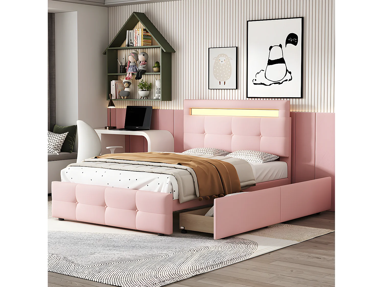 Lit avec tiroirs - 90x200 cm avec lampes LED - rose - Sweiko