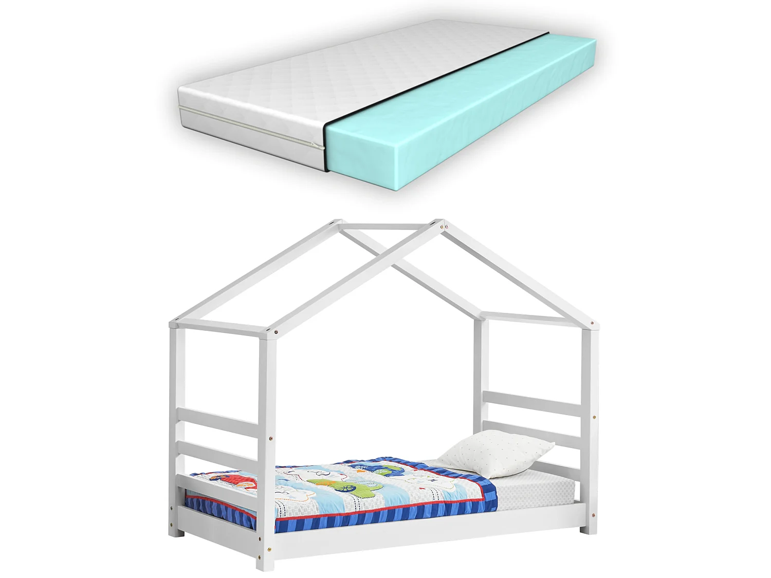 Lit Cabane Vardø Avec Grille Et Matelas Orthopédique 80 X 160 Cm Blanc