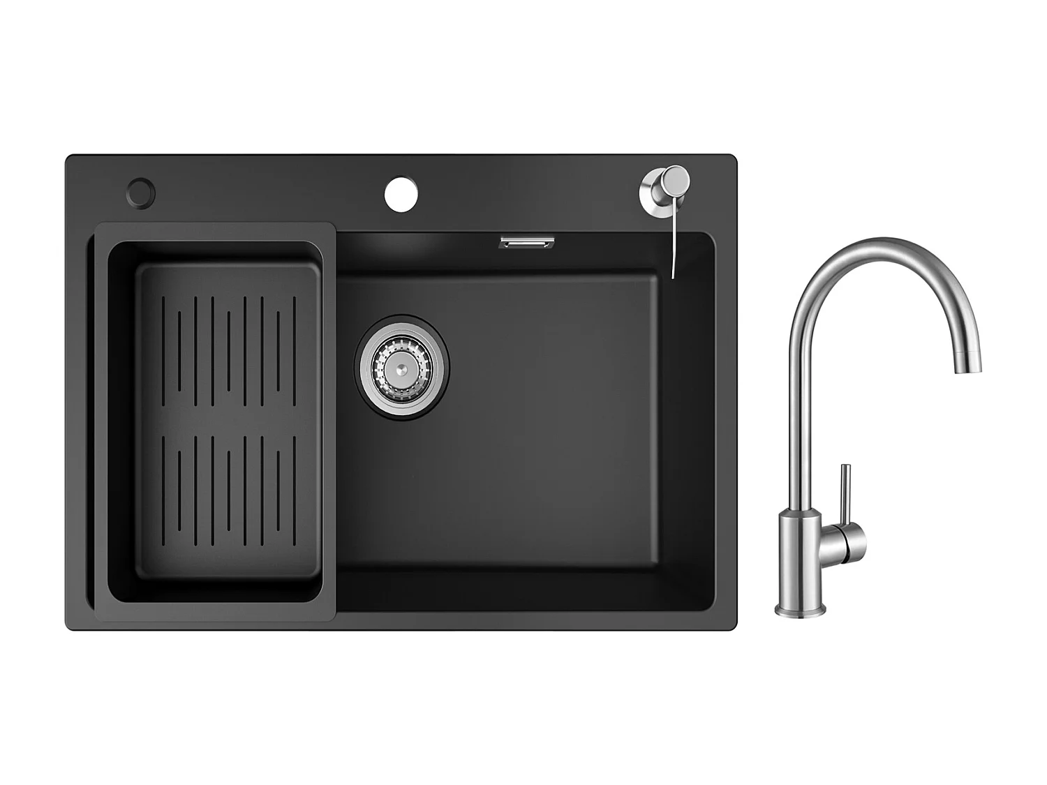 Evier 1 Bac 70x45cm Noir Evier en Quartz avec Panier de Vidange et Distributeur de Savon + Mitigeur de Cuisine en Inox Brossé
