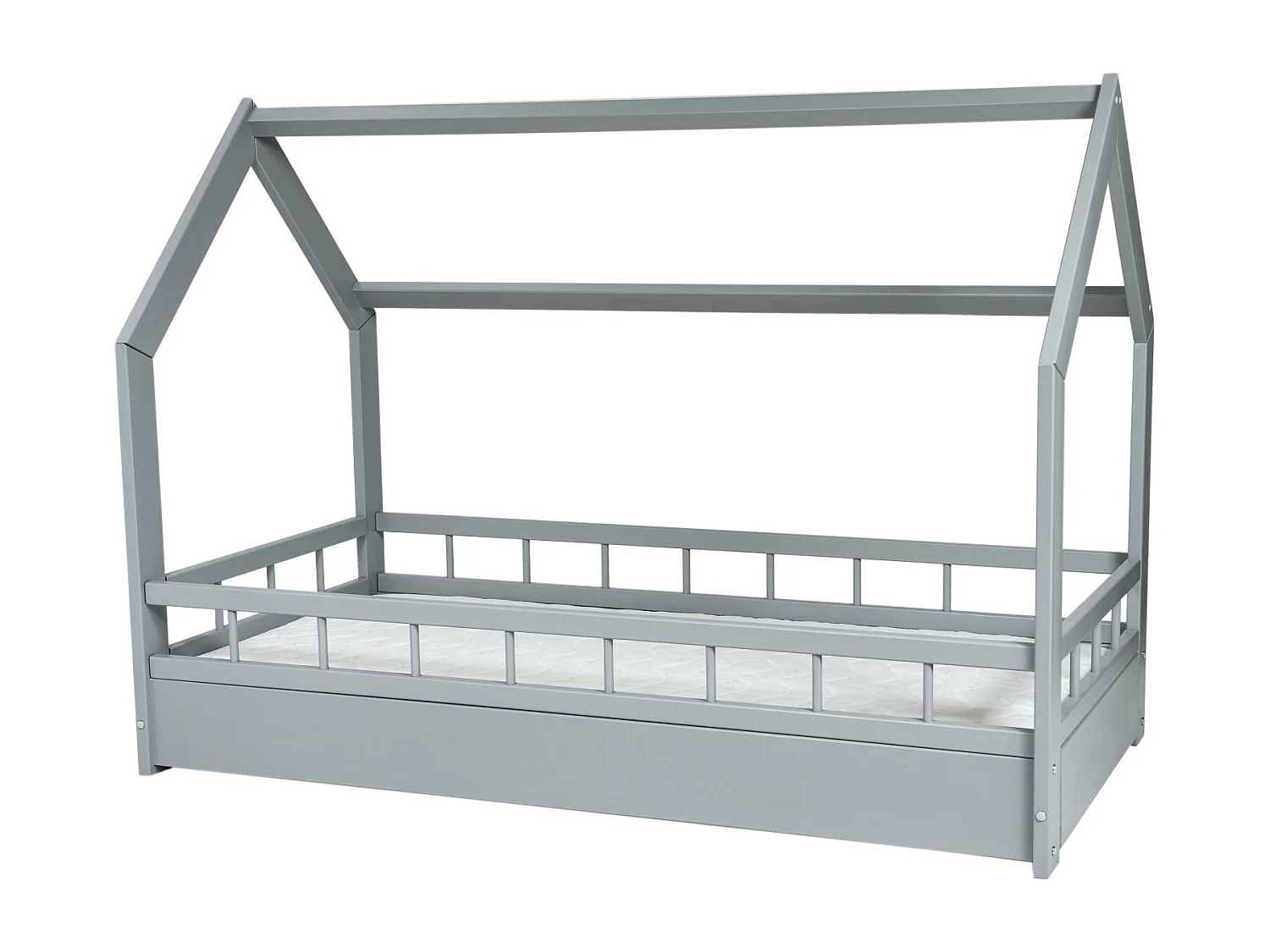 Lit pour enfant Maison Cabane 2-en-1 avec Barreaux et matelas : Ambiance Naturelle Boisée 160x80 cm - Gris